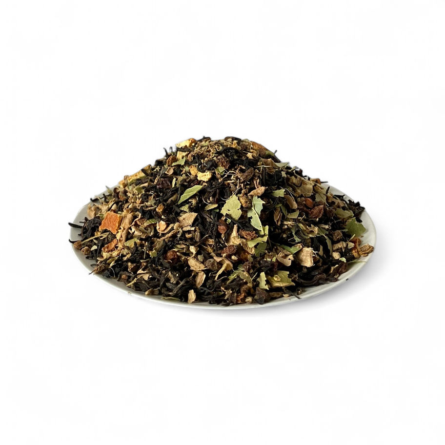 Složení: černý čaj Assam v BIO kvalitě, zázvor kořen, rakytník plod, šípek plod, anýz vonný plod, lípa srdčitá květ, přírodní aroma svařené víno s pomerančem.